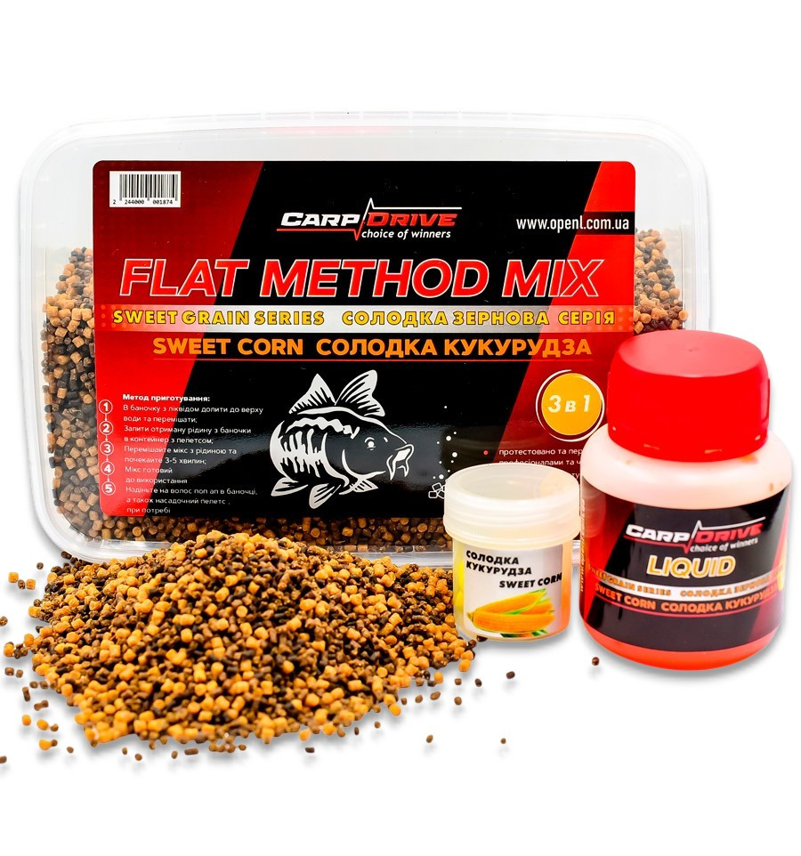 Данный комплект представляет собой универсальную систему для ловли мирной рыбы, построенную на самом популярном аромате — сладкой кукурузе. Это «золотой стандарт» прикормки, который одинаково эффективно привлекает как капризного карпа, так и активного белого амура. Если вы решили купить флет метод микс, который будет работать на любом незнакомом водоеме, вариант Sweet Corn станет самым надежным выбором.