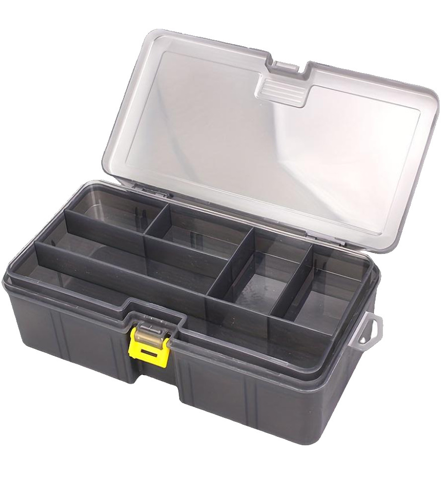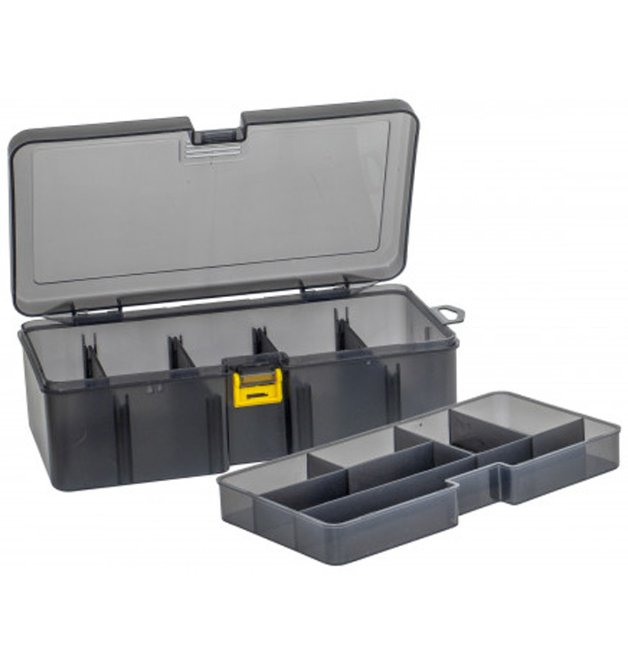 Конструкция коробки позволяет разделить снасти по частоте использования и размеру, обеспечивая быстрый доступ к нужному элементу:
