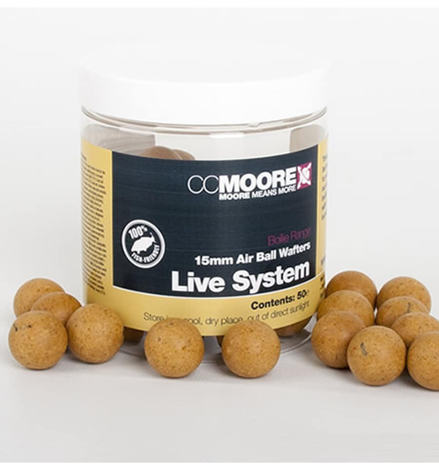 Бойли нейтральної плавучості CC Moore Live System Air Ball Wafters. Здібні тривалий час знаходиться під водою, не втрачаючи своїх привабливих властивостей. Підходять для використання як по теплій, так і по холодній воді. Приманка виготовлена із натуральних інгредієнтів високої якості