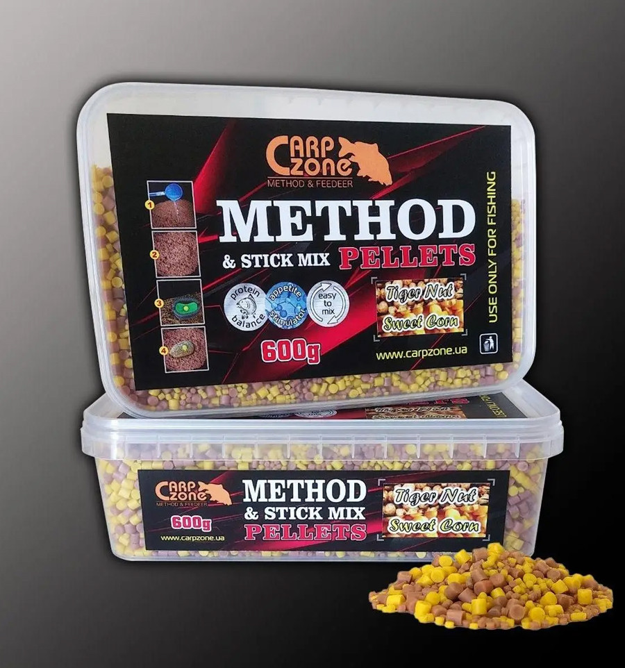 Механіка роботи: при зволоженні пелетс стає клейким для закидання, проте на дні швидко розпадається, вивільняючи частинки тигрового горіха та кукурудзяні атрактанти.