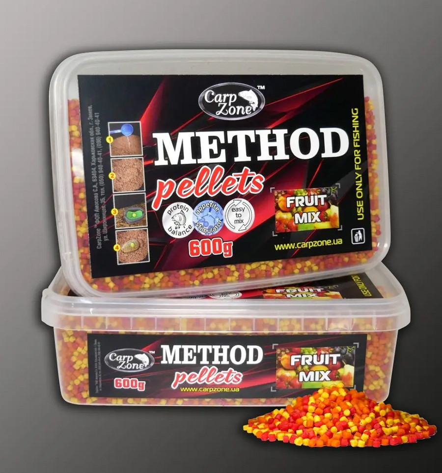Метод-стік мікс пелетс CarpZone Method & Stick Mix Pellets Fruit Mix 2-4mm 600g — це багатокомпонентна фруктова суміш, розроблена для активного залучення коропових риб. Комбінація гранул з різними фруктовими ароматами та фракція 2-4 мм забезпечують стабільну роботу прикормки як у флет-годівницях, так і в ПВА-стіках.