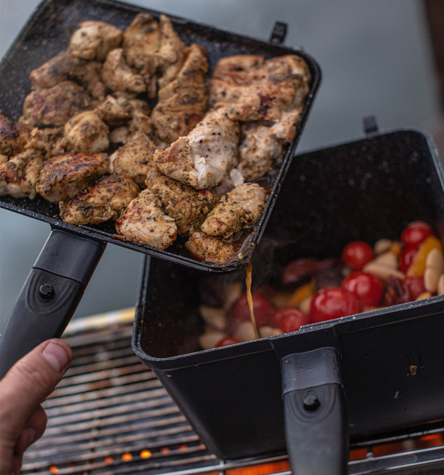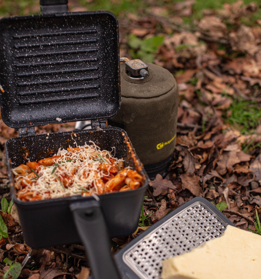 Універсальність системи: Сковорода-гриль повністю сумісна з тостером RidgeMonkey Connect Sandwich Toaster Granite Edition, що дозволяє комбінувати елементи посуду під різні завдання.