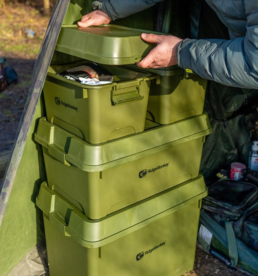 Інженери RidgeMonkey впровадили систему Smart Stacking (розумне штабелювання) . Спеціальні пази на кришці дозволяють надійно ставити ящики одна на одну, створюючи стійку колону. Це критично важливо для економії місця в наметі чи багажнику автомобіля – ящики не змістяться під час транспортування.